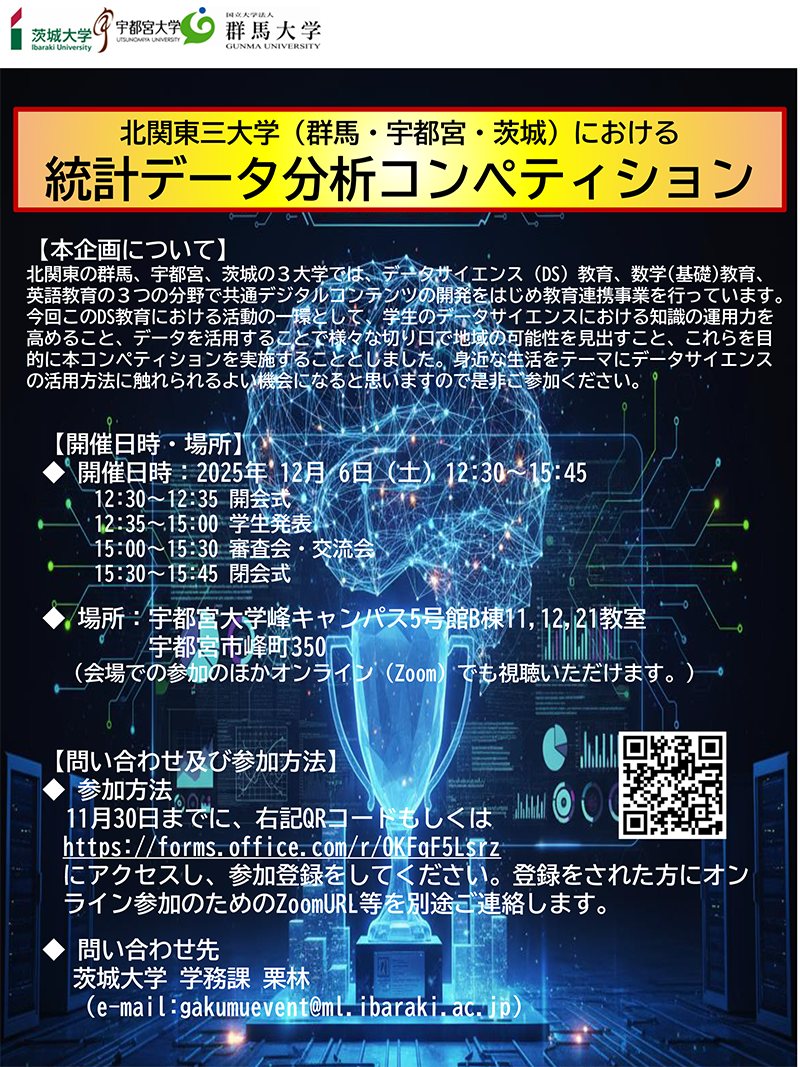 2025年12月6日に群馬大学、宇都宮大学、茨城大学の3大学で統計データ分析コンペティションが開催されました。